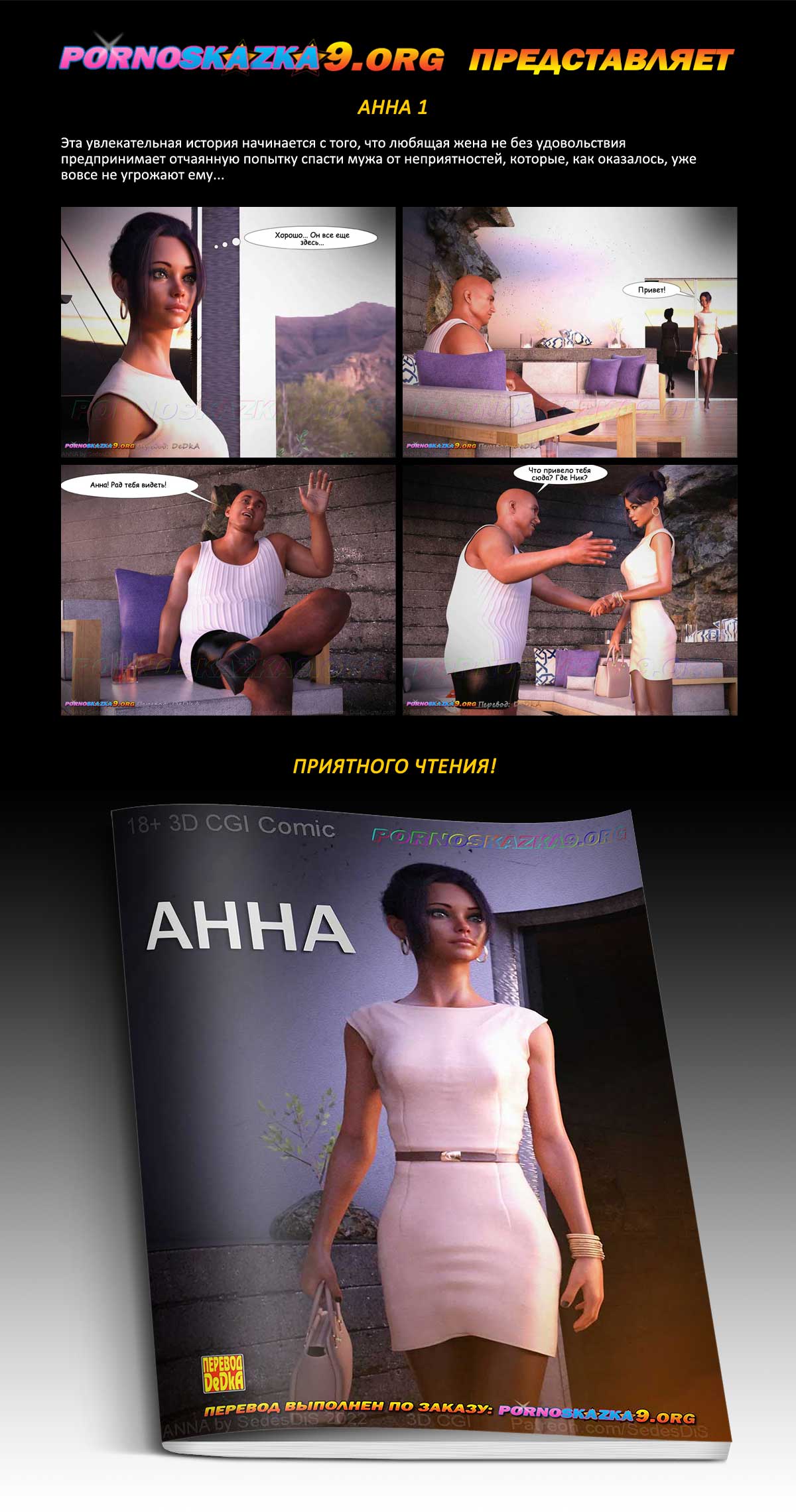 Порно комикс «Анна. Часть 1.» Эта увлекательная история начинается с того, что любящая жена не без удовольствия предпринимает отчаянную попытку спасти мужа от неприятностей, которые, как оказалось, уже вовсе не угрожают ему…